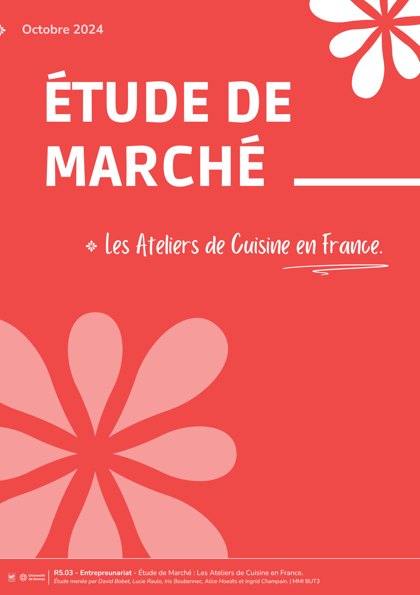 Ce projet de création d'ateliers de cuisine a commencé par une étude de marché approfondie pour analyser l'existant, identifier les tendances et déterminer un concept innovant. L'objectif était de concevoir une offre d'ateliers culinaire unique, tout en créant une communication percutante et en gérant efficacement les différents aspects opérationnels, y compris la gestion de crise.