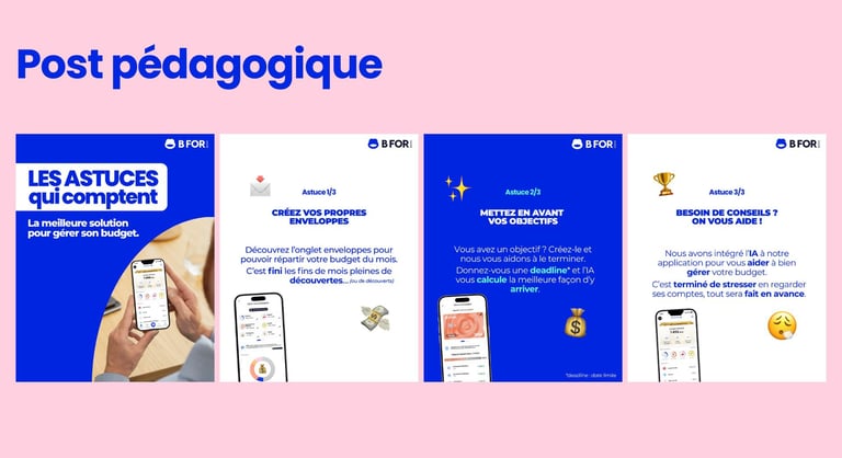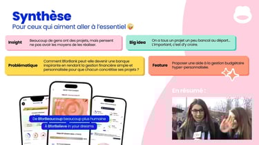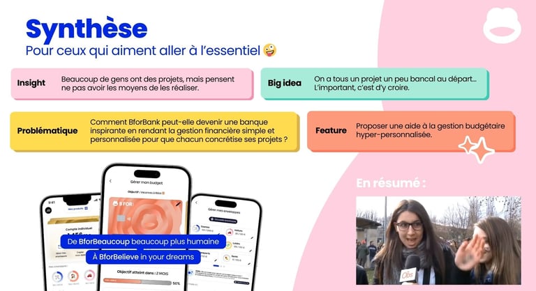 J’ai participé à l’analyse stratégique : définition des cibles (clients historiques, nouveaux clients, et cible prioritaire 35–45 ans urbains), compréhension des attentes (besoin d’anticiper, de mieux gérer, d’être rassuré), et identification des leviers différenciants de BforBank (crédibilité d’une “vraie banque”, conseillers, app fluide, cartes virtuelles). J’ai contribué à transformer ces constats en recommandations concrètes : proposition de valeur, axes de communication, et construction d’une feature produit différenciante, pensée pour être intégrée à l’application et mesurable via des indicateurs simples (adoption, engagement, satisfaction, amélioration du suivi budgétaire).