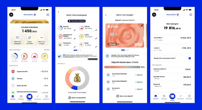 J’ai participé à imaginer une fonctionnalité alignée avec Digital Banking with Care : un coach budget intégré à l’app, qui aide l’utilisateur à construire un budget réaliste, suivre des enveloppes et avancer vers des objectifs (voyage, travaux, achat…). L’intérêt est de rendre la promesse “care” tangible : des conseils personnalisés, des alertes utiles et positives, et une visualisation claire des progrès. Cette feature sert aussi de pilier à la campagne : on ne communique pas seulement sur un service disponible, mais sur une expérience qui simplifie réellement la gestion de l’argent et réduit la charge mentale.