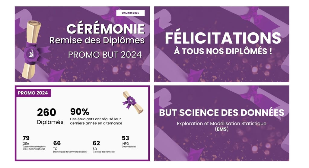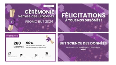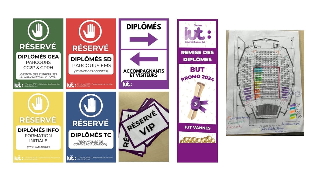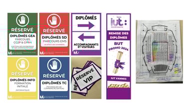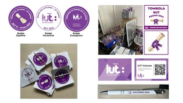 Contribution à la communication autour de l’événement à travers l’envoi de questionnaires, la diffusion d’informations par mail et le relais sur les réseaux sociaux de l’IUT comme LinkedIn, Instagram et Facebook. Conception de nombreux supports nécessaires au bon déroulement et à l’identité visuelle de la cérémonie : affiches d’orientation, signalétique, badges pour les diplômés, le personnel et les enseignants, ainsi que différents éléments de décoration. Réalisation d’un post récapitulatif après la cérémonie afin de prolonger sa visibilité et de valoriser les temps forts du projet.
